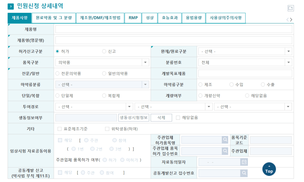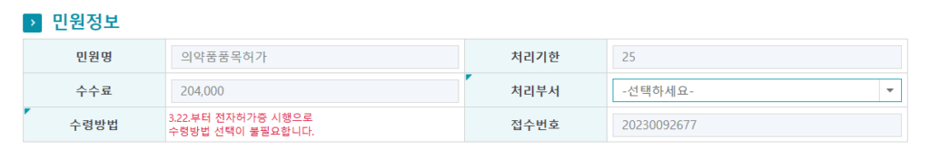 처리부서는 필수로 입력해야 합니다.(식약처 허가총괄담당관 및 각 지방청 중 선택하게 되어 있습니다.)