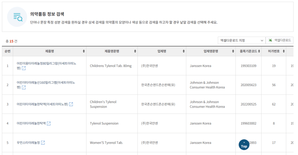 (‘타이레놀’검색 결과 예시)