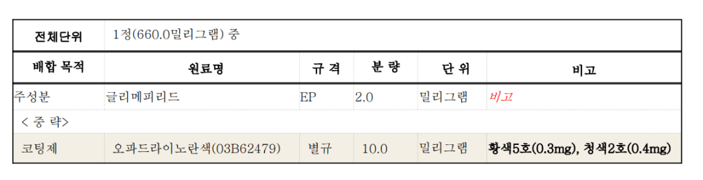 타르색소 분량이 총 분량의 0.1% 초과하는 경우 명칭, 분량을 모두 기재한다.