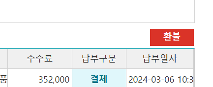 납부구분 ‘결제’클릭 시 우측 상단의 붉은 환불 버튼 클릭