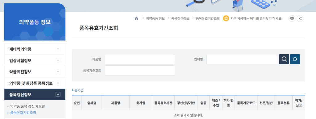 의약품등 정보 → 품목갱신정보 → 품목유효기간, 갱신신청기한 살펴볼 수 있음.