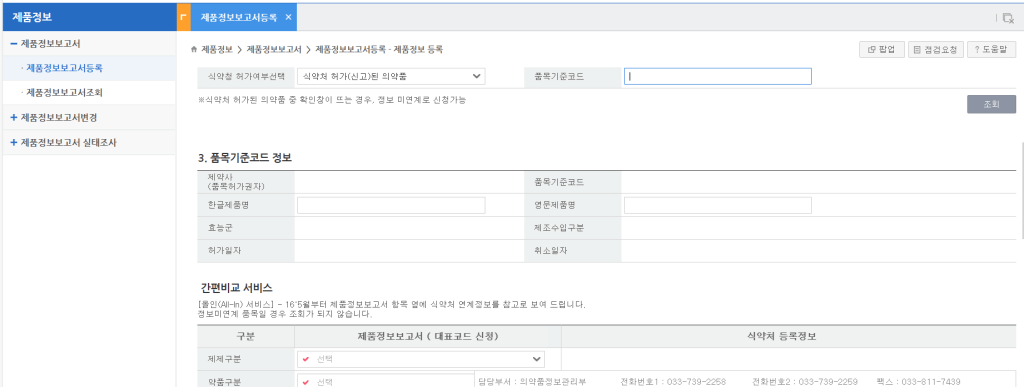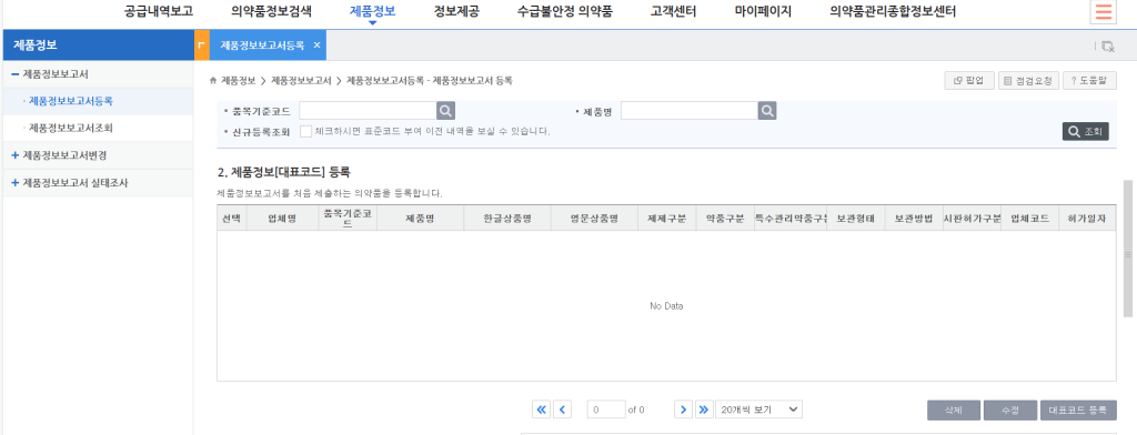 ‘품목기준코드’ 란에 품목기준코드 작성 후 조회하면 제품명이 조회된다. (품목기준코드는 품목허가증 1면에서 확인 가능)