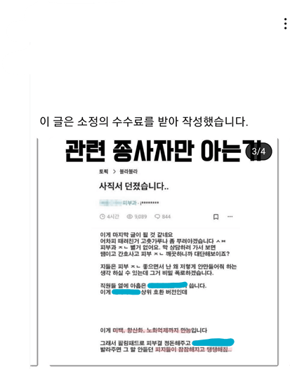- 후기 형식의 글을 광고한다.(그런데 후기를 광고로 돌리면서 해당 후기글은 절대 광고가 아니고 내돈내산임을 강조한다; 다른 두 개는 법을 잘 몰라서 그랬다고 쳐도 만약 업체에서 작성한 후기글이라면 이건 정말 기망이다.)